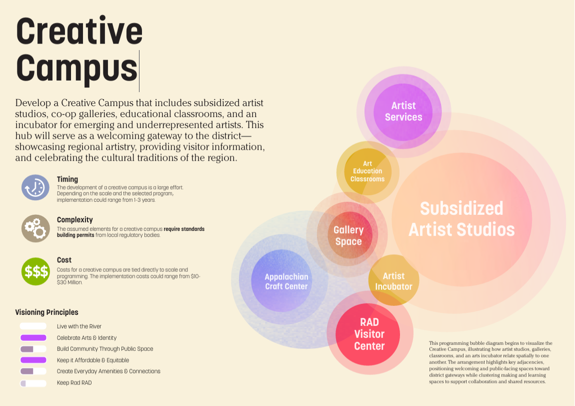 The Creative Campus will serve as a permanent cultural anchor for the River Arts District and the region. It will include: